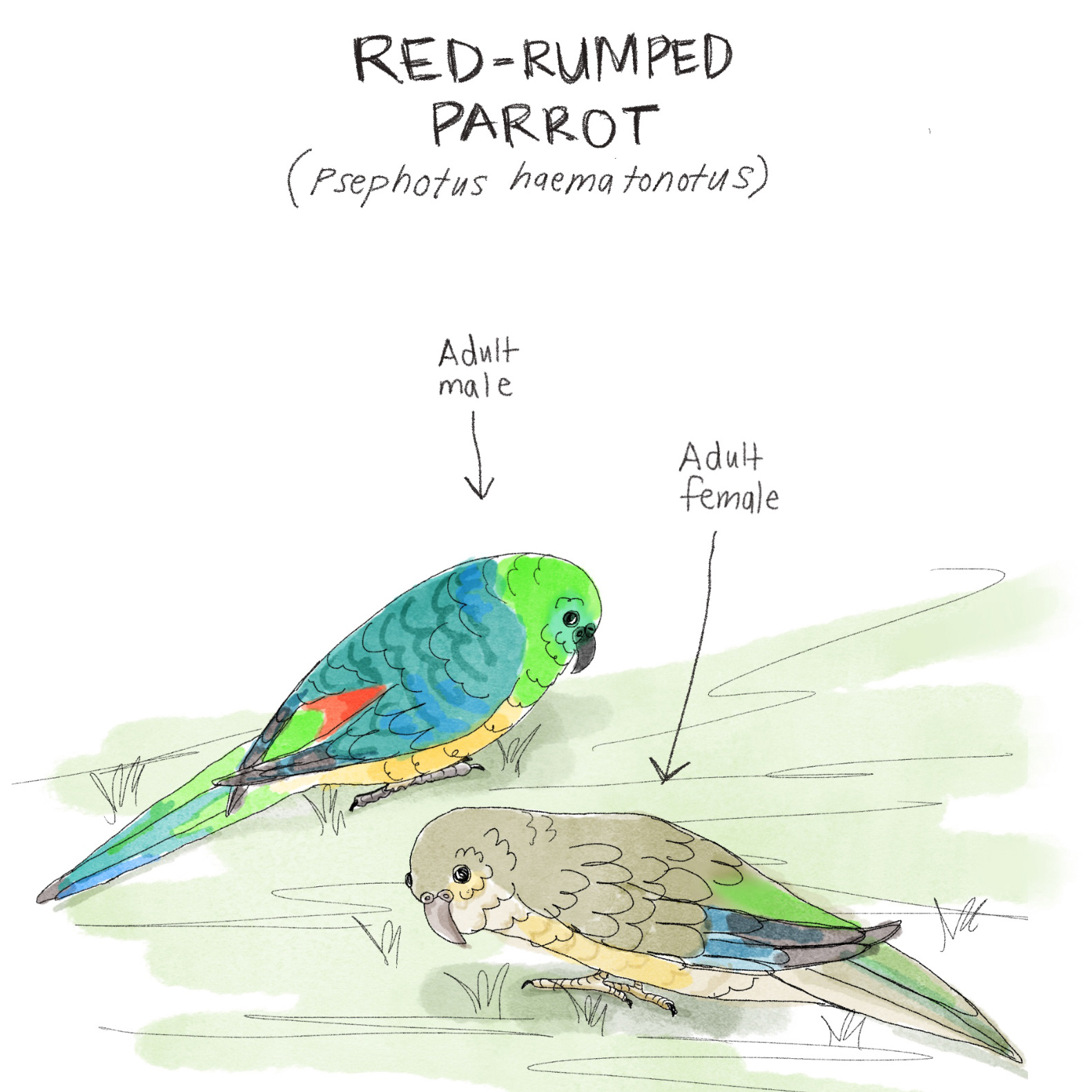 You will usually see red-rumped parrots in the grass, eating and sweetly chirping away to each other. Amazingly enough, despite how brightly coloured the male is, both the male and the female can be hard to spot in the grass as you're walking by. If you don't notice them (or if you don't look directly at them), you can get very close to them before they fly away. These are my all-time favourite Canberra-area bird—so much so that I refer to them as: 'Faves'.