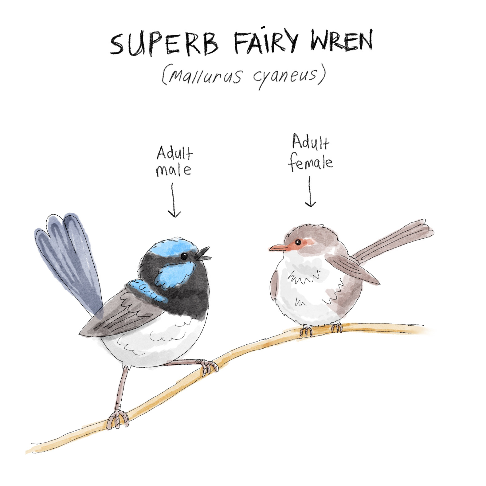 You will find most often find these fluffy little golfballs in small, dense bushes or tall, dense grass—always flitting around, always chirping. It's such a delight to see the striking colours of the male fairy wren as he darts out from the bushes on a mission, but I believe the subtle colours of the female are equally as beautiful. I can watch them and their antics for hours!