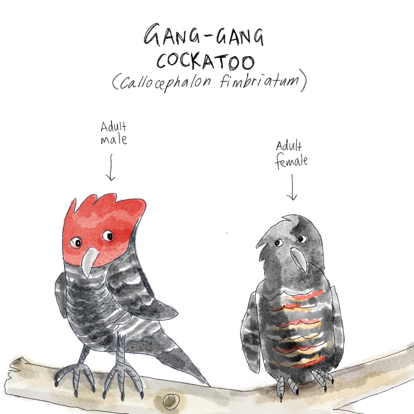 You will most often find gang-gang cockatoos in large trees quietly nibbling away on seeds, nuts or fruits, or snuggling together. They seem very gentle. When they fly they tend to make a distinctive croaky screech. I am always excited to hear or see them.