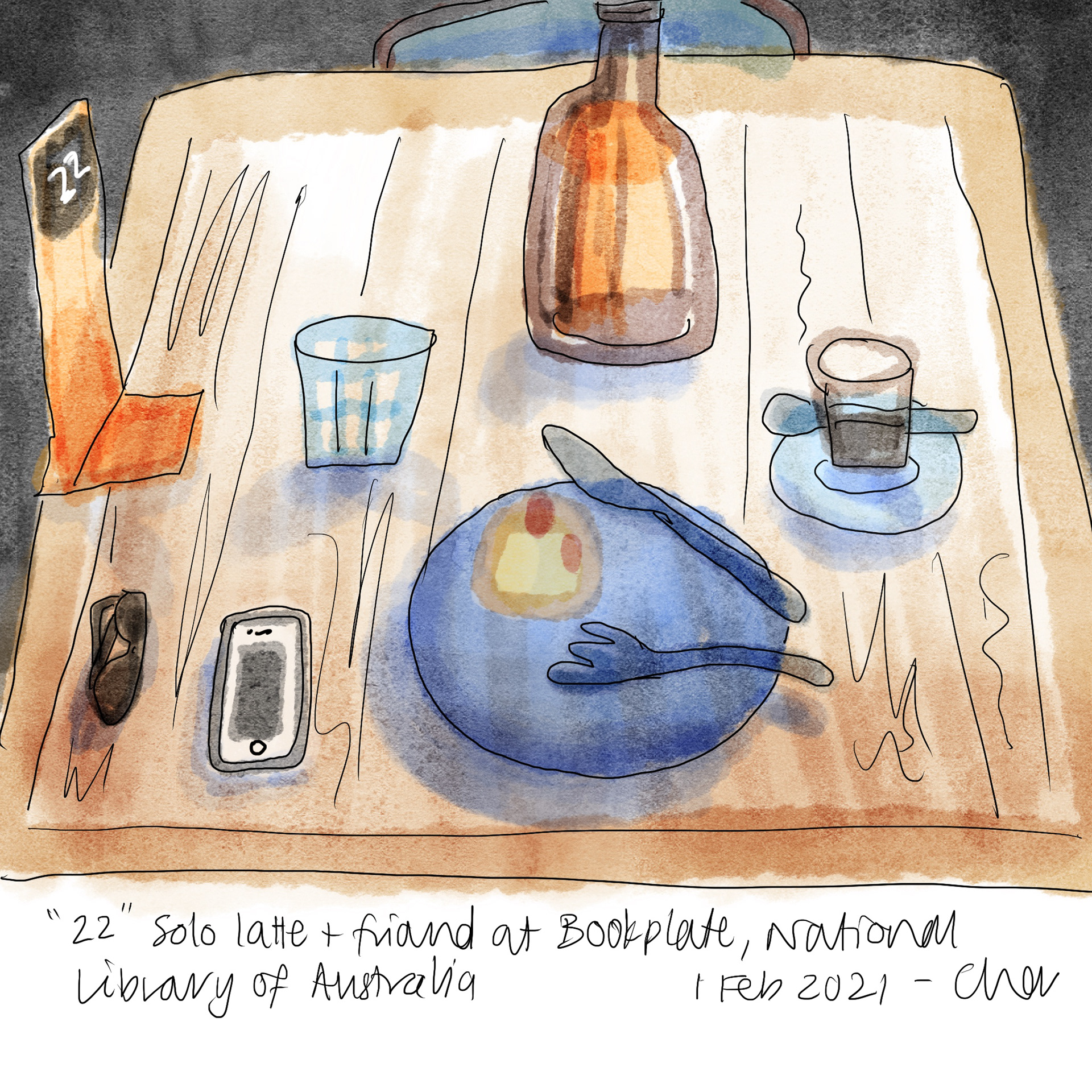 A quick (10-minute) sketch of my table and meal at my favourite cafe. This is a digital 'watercolour' and 'pen' sketch using Procreate. I mimicked an approach I often take when drawing in the field—laying down a rough watercolour impression and then refining it with pen over the top. I hoped to achieve the same spontaneous and imperfect quality that I get when using actual watercolour on paper. In some ways this was made easy by the fact that the Apple pencil does not behave like a brush! I just tried to go with it. At least I didn't have to wait for anything to dry!