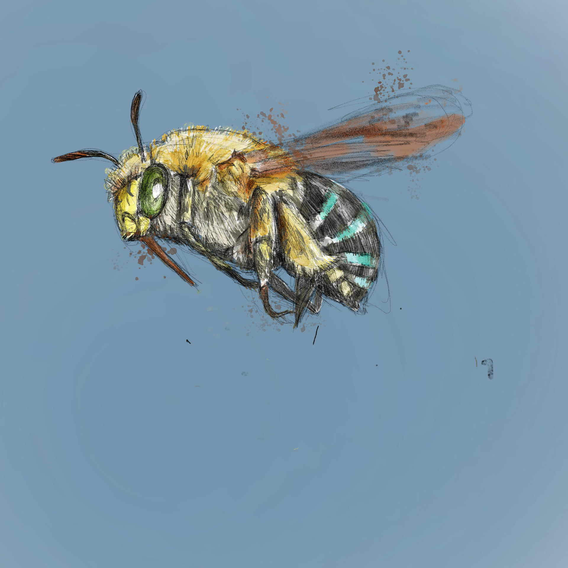 A quick digital sketch to get to know the blue-banded bee and also Adobe Fresco. 'Pencil', 'watercolour' and 'coloured pencil'. [Scroll down to see a timelapse version.]