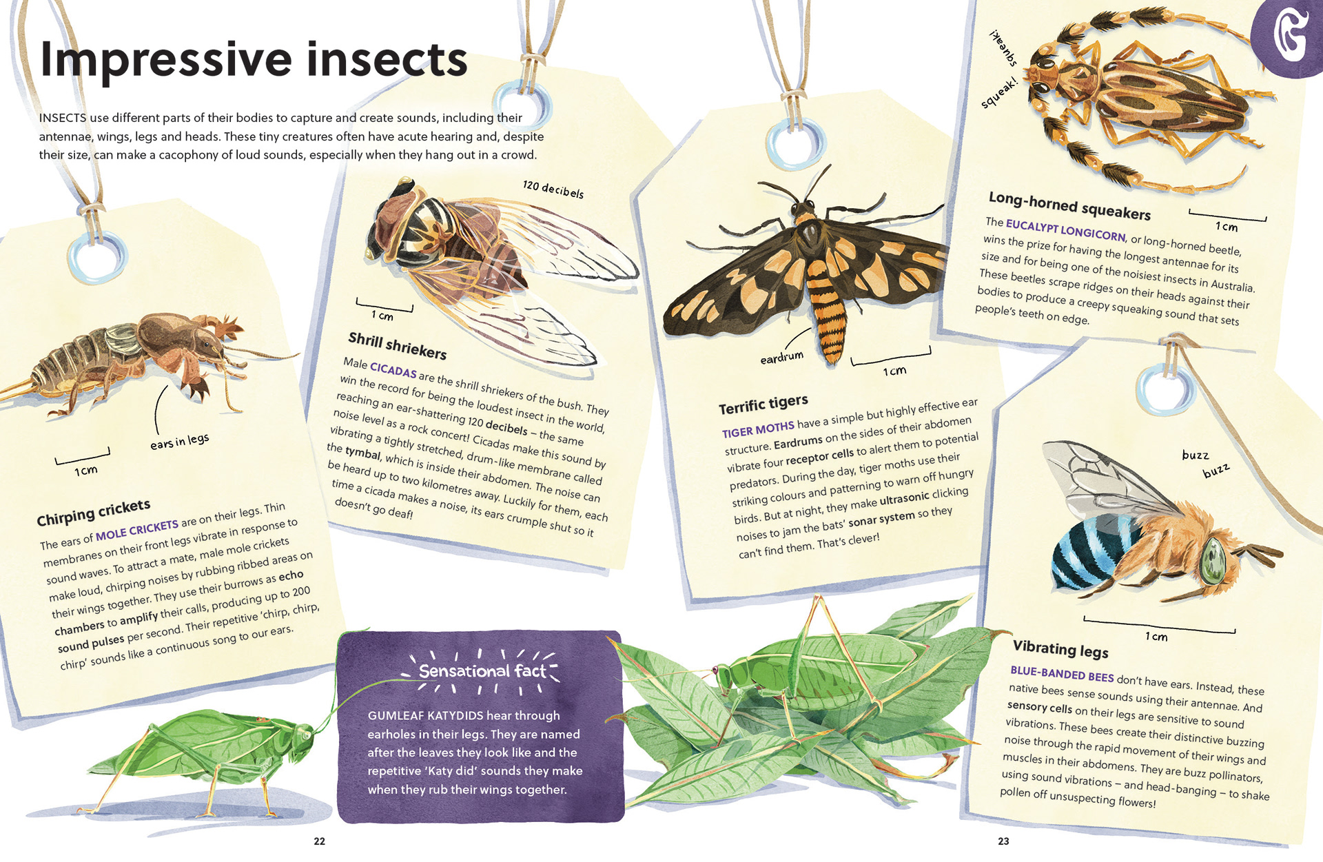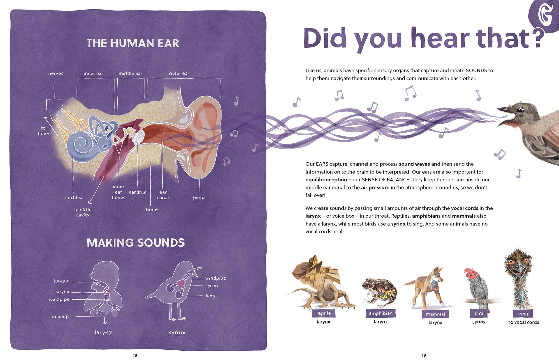 "My favourite thing about this book is how it compares the world of sight, sound, smell, taste and touch of Australian wildlife with these senses in humans. When explaining the world of making and hearing sound there is a simple illustrated diagram of a human ear, the human larynx and a bird syrinx (note the book does not shy away from hard words, but explains them in fun and effective ways).
