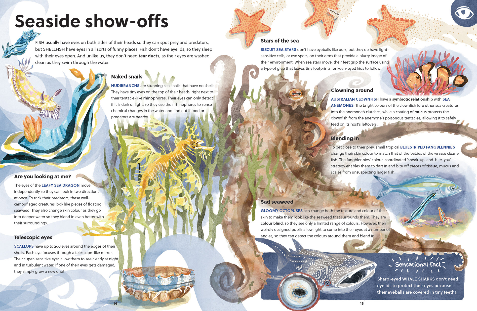 The book covers more than 145 truly astounding animals – from sharp-eyed whale sharks to sticky-bellied green tree frogs. It showcases the strange things these creatures can do with their eyes, ears, noses, mouths and skin! Meet unique Australian birds that laugh, frogs that quack, fish that sing, mammals that glow in the dark, seahorses disguised as seaweed, turtles that breathe through their bums and lizards that clean their eyes with their tongues!